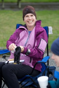 We prepared ourselves well for the anticipated frigid onslaught; not only would we be warm during the run, we also threw our sleeping bags in the trunk in case we needed to bundle up after the race. I wore a full torso jog bra and my Royal Victoria long-sleeved technical shirt under an even warmer running shirt, along with my heavy L.L. Bean running jacket. I also threw some long johns into my bag in case my Nike running pants wouldn’t be warm enough. Wear nothing new on race day? Pish posh, I say! I had two pairs of gloves — one heavier and warmer, one lighter — as well as a lightweight wool cap and a neoprene face mask. Mother Nature — BRING. IT. ON.